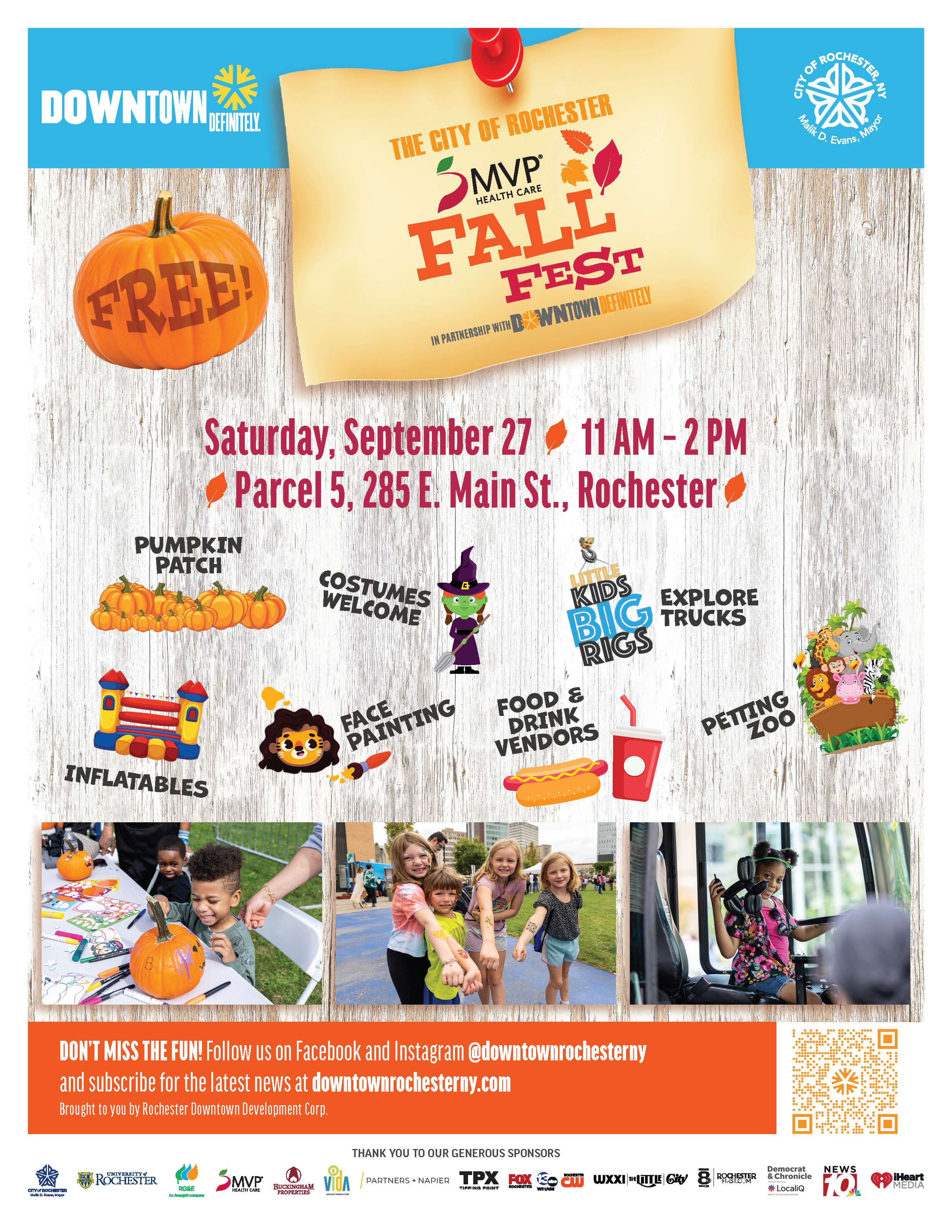 Co-produced with the City of Rochester, the MVP Health Care Fall Fest is a seasonal celebration with pumpkin decorating, giant inflatables, a petting zoo, games, crafts, giveaways, and the Cityβs βLittle Kids and Big Rigsβ program, where children can explore police cars, fire trucks, SWAT vehicles, construction equipment, and more.